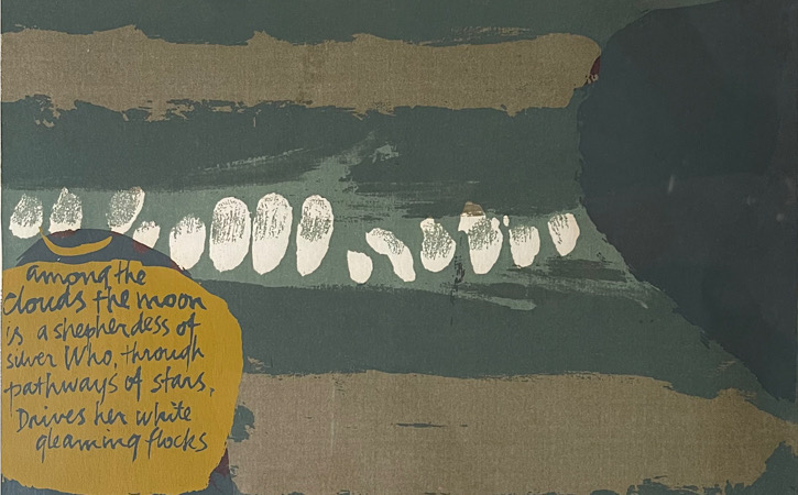 Conrad Krause was the soldiers name and we became good friends. When his two years were up, he took a year to travel the US and to make the decision whether or not to become a priest. During that time he visited Sister Corita Kent’s studio. Little did I know I would meet him again when I married a Detroiter and Conrad had an assignment at the seminary on Chicago Blvd. He indeed became a priest, and got in touch with me here and came to visit bearing a Corita Kent seriograph he had gotten for me on his decision tour. That was my first introduction to Corita. I now have three prints—gifts—in my kitchen and one he have in my livingroom.
