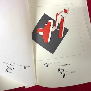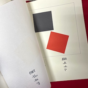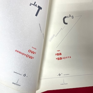 Two softcover books in paper slipcase: A facsimile of Russian/Soviet artist El Lissitzky’s revolutionary 1922 children’s book “About Two Squares” (“Pro Dva Kvadrata”), the story of two squares that take on the mission of rebuilding the world; and “More About 2 Squares,” an essay on Suprematism by art historian Patricia Railing. Each page of Lissitzky’s book features a tissue overlay with an English translation designed to mimic the original text. 1991, MIT Press. Some wear on slipcase, books in very fine condition. [27.1]
