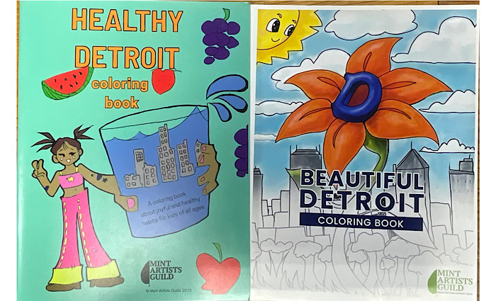 Healthy Detroit Coloring Book is the latest book by the Mint Artists Guild, a nonprofit promoting art to Detroit youth. The book is 24 pages, made by Detroit youth artists in the summers of 2022-2025, paperback, staple bound and a fundraiser for the Mint Artist Guild.