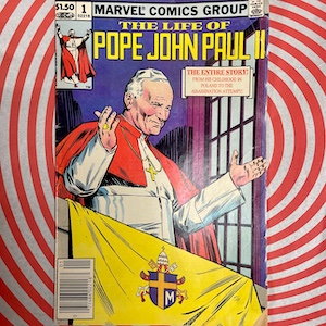 1982 Marvel Comics “Vol. 1 No 1.” Comic book biography of Karol Wojtyla, aka Pope John Paul II, “the entire story from his childhood to the assassinatin attempt.” Slight damage to covers and some back pages, but otherwise in good condition. Writer: Steven Grant; Pencils: John Tartaglione; Inks: Joe Sinnott. [GCB2]